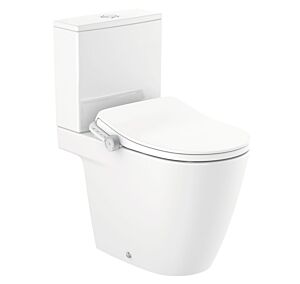 Close-coupled smart toilet with dual flush (4,5/3 litres) and dual outlet. Roca Rimless® , seat and cover and washing and drying function included. Needs power supply
