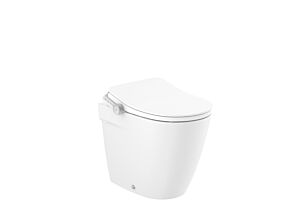 Back to wall single floorstanding smart toilet with dual outlet. Roca Rimless® , seat and cover with washing and drying function included. Needs power supply.