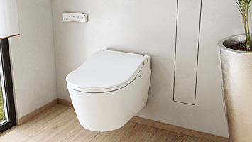Serene minimalism in Pure White: RW White Trim with matching remote and matt flush plate—now in stock at shower-toilet-centre.co.uk.
