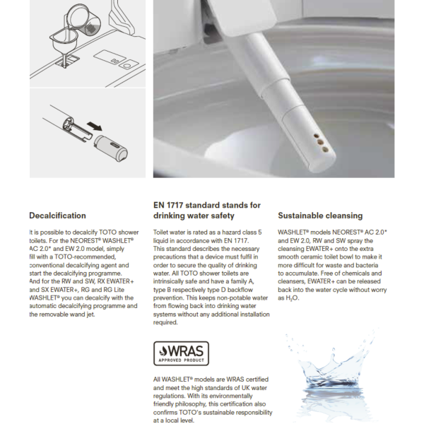 Of course, WASHLET™ RW comes equipped with all of the characteristic hygiene and comfort features: warm water spray, heated seat, odour-absorbing deodoriser and dryer. In addition, the EWATER+ feature cleans WASHLET™ wand jet and the toilet bowl with electrolysed water after use.
