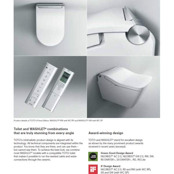 TOTO WASHLET RW has more to offer than just its slim profile: It is equipped with many of TOTO's well-known hygiene features, such as automatic open and close of the lid and even includes a new one as well.